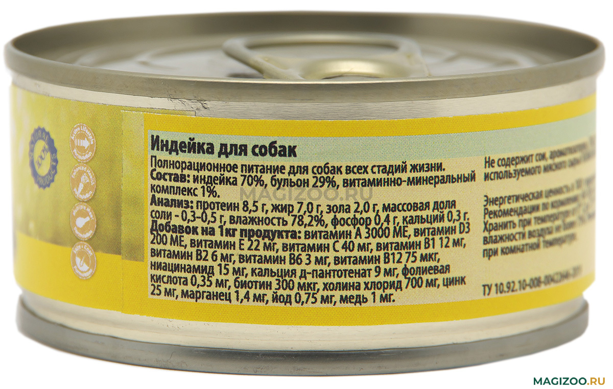 Полнорационный консервированный корм для собак всех стадий жизни из индейки.