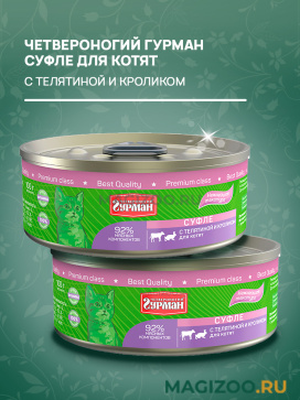 Консервы для котят ЧЕТВЕРОНОГИЙ ГУРМАН СУФЛЕ из телятины и кролика с нежнейшей текстурой – побалуйте своего питомца вкусным и полезным кормом!Ключевые особенности:• 92 % мясных компонентов.• Уникальная рецептура.• Высокая поедаемость.• Нежнейшая текстура.• 100 % натурально.• Комплекс витаминов здоровья для Вашего питомца.ЧЕТВЕРОНОГИЙ ГУРМАН СУФЛЕ – кошкам нравится!Состав:Субпродукты куриные, телятина, кролик, плазма крови, животный белок, желирующая добавка, аминокислоты (таурин, глицин), краситель натуральный карамель.Гарантированный анализ:Протеин - 9 грЖир – 5 грКлетчатка – 0,5 грЗола – 2 грТаурин – 0,2 грВлага - 85 грМинеральные вещества (на 100 гр):