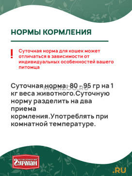 А – 561 МЕ, Е – 0,1 МЕ, В1 – 0,03 мг, В2 – 0,14 мг, В3 – 1,8, B4 - 33,1 мг, мг, В5 – 0,48 мг, В6 – 0,07 мг, B12 - 0,01 мг.Энергетическая ценность: 81 кКал/100 гр.Рекомендации по кормлению:Суточная норма: 80 - 95 гр на 1 кг веса животного.Суточную норму разделить на два приема кормления.Употреблять при комнатной температуре.Страна-производитель: Россия.