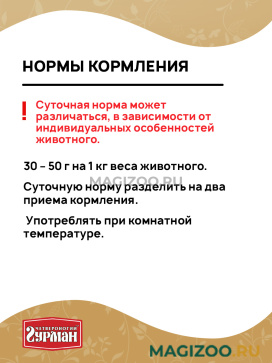 Норма кормления: 30 – 50 г на 1 кг веса животного. Суточную норму разделить на два приема кормления. Употреблять при комнатной температуре.