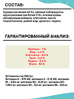 Индейка (не менее 20 %), курица, мясные субпродукты, крупа рисовая (не более 3 %), плазма крови, желирующая добавка, клетчатка, масло подсолнечное, рыбий жир, дрожжи, таурин.