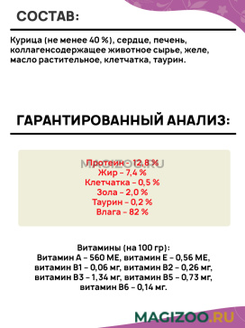 Курица (не менее 40 %), сердце, печень, коллагенсодержащее животное сырье, желе, масло растительное, клетчатка, таурин.