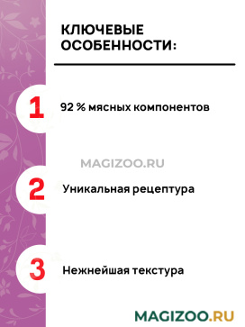 Рецептуры корма богаты по ингредиентам - мясо и всевозможные субпродукты обеспечивают лакомый вкус и притягательный аромат, высокую питательность, а также насыщенный комплекс витаминов и минералов. Не содержат злаков, бобовых и овощей, а также синтетических витаминно-минеральных комплексов