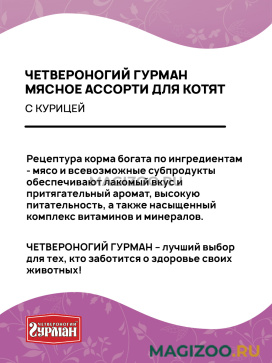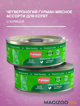 Консервы Четвероногий Гурман МЯСНОЕ АССОРТИ для котят с курицей можно назвать кормом класса суперпремиум.