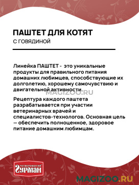 Рецептура каждого паштета разрабатывается при участии ветеринарных врачей и специалистов-технологов. Основная цель — обеспечить полноценное, здоровое питание домашним любимцам.
