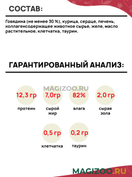 Говядина (не менее 30 %), курица, сердце, печень, коллагенсодержащее животное сырье, желе, масло растительное, клетчатка, таурин.