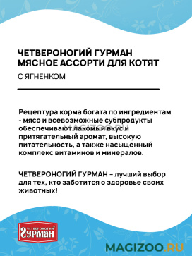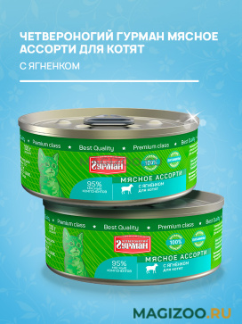 Консервы Четвероногий Гурман МЯСНОЕ АССОРТИ для котят с ягненком можно назвать кормом класса суперпремиум.