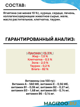 Ягнятина (не менее 10 %), курица, сердце, печень, коллагенсодержащее животное сырье, желе, масло растительное, клетчатка, таурин.