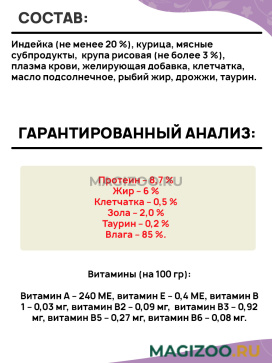 Индейка (не менее 20 %), курица, мясные субпродукты, крупа рисовая (не более 3 %), плазма крови, желирующая добавка, клетчатка, масло подсолнечное, рыбий жир, дрожжи, таурин.
