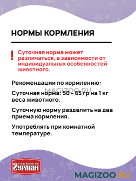 Суточная норма: 50 – 65 гр на 1 кг веса животного.