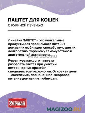 Рецептура каждого паштета разрабатывается при участии ветеринарных врачей и специалистов-технологов. Основная цель — обеспечить полноценное, здоровое питание домашним любимцам.