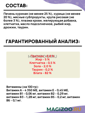 Печень куриная (не менее 25 %), курица (не менее 20 %), мясные субпродукты, крупа рисовая (не более 3 %), плазма крови, желирующая добавка, клетчатка, масло подсолнечное, рыбий жир, дрожжи, таурин.