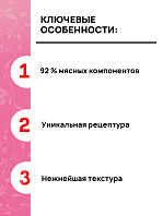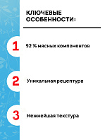 Рецептуры корма богаты по ингредиентам - мясо и всевозможные субпродукты обеспечивают лакомый вкус и притягательный аромат, высокую питательность, а также насыщенный комплекс витаминов и минералов. Не содержат злаков, бобовых и овощей, а также синтетических витаминно-минеральных комплексов