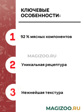 Рецептуры корма богаты по ингредиентам - мясо и всевозможные субпродукты обеспечивают лакомый вкус и притягательный аромат, высокую питательность, а также насыщенный комплекс витаминов и минералов. Не содержат злаков, бобовых и овощей, а также синтетических витаминно-минеральных комплексов