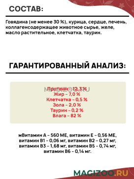 Говядина (не менее 30 %), курица, сердце, печень, коллагенсодержащее животное сырье, желе, масло растительное, клетчатка, таурин.
