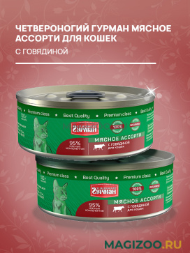 Консервы Четвероногий Гурман МЯСНОЕ АССОРТИ для взрослых кошек с говядиной можно назвать кормом класса суперпремиум.