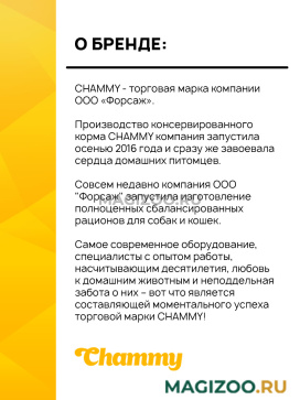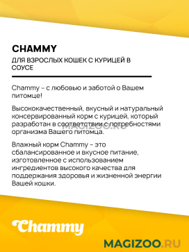 Информация о составе и ингредиентах, цветовом решении, технических и иных характеристиках, стране-изготовителе, внешнем виде и комплекте поставки товара носит справочный характер и основана на последних доступных к моменту публикации сведениях. Доставка данного товара осуществляется во все регионы РФ.Производство консервированного корма CHAMMY компания запустила осенью 2016 года и сразу же завоевала сердца домашних питомцев.