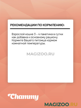 Взрослой кошке 3 – 4 пакетика в сутки как добавка к основному рациону. Кормите Вашего питомца кормом комнатной температуры.