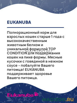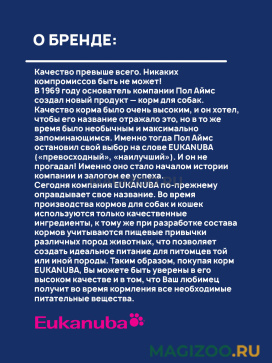 Информация о составе и ингредиентах, цветовом решении, технических и иных характеристиках, стране-изготовителе, внешнем виде и комплекте поставки товара носит справочный характер и основана на последних доступных к моменту публикации сведениях. Доставка данного товара осуществляется во все регионы РФ.В 1969 году основатель компании Пол Аймс создал новый продукт — корм для собак. Качество корма было очень высоким, и он хотел, чтобы его название отражало это, но в то же время было необычным и максимально запоминающимся. Именно тогда Пол Аймс остановил свой выбор на слове EUKANUBA («превосходный», «наилучший»). И он не прогадал! Именно оно стало началом истории компании и залогом ее успеха.