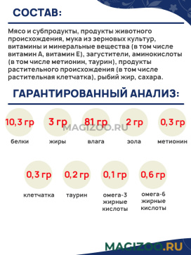 Мясо и субпродукты, продукты животного происхождения, мука из зерновых культур, витамины и минеральные вещества (в том числе витамин А, витамин Е), загустители, аминокислоты (в том числе метионин, таурин), продукты растительного происхождения (в том числе растительная клетчатка), рыбий жир, сахара.