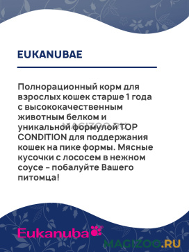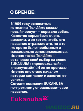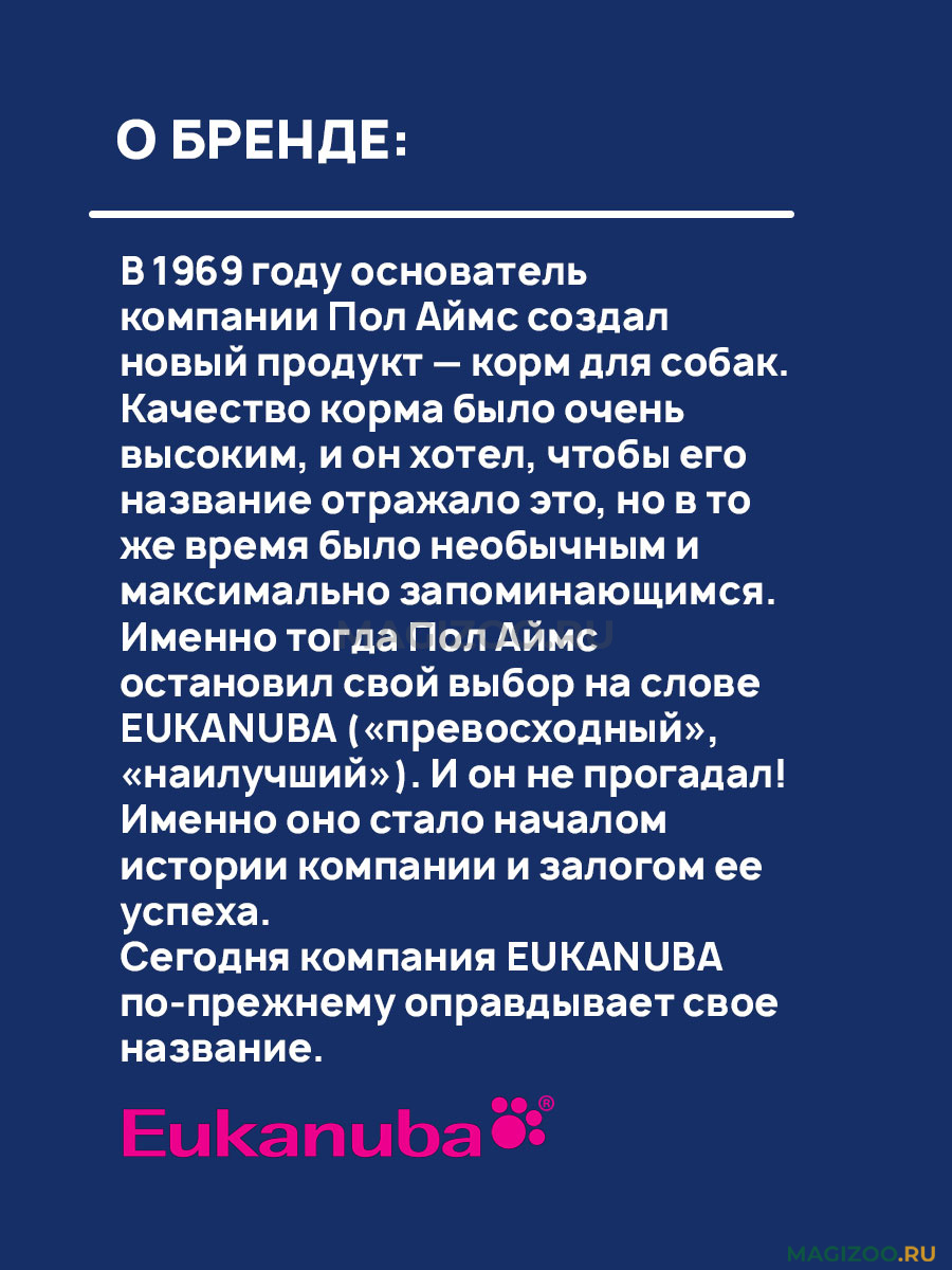 Информация о составе и ингредиентах, цветовом решении, технических и иных характеристиках, стране-изготовителе, внешнем виде и комплекте поставки товара носит справочный характер и основана на последних доступных к моменту публикации сведениях. Доставка данного товара осуществляется во все регионы РФ.В 1969 году основатель компании Пол Аймс создал новый продукт — корм для собак. Качество корма было очень высоким, и он хотел, чтобы его название отражало это, но в то же время было необычным и максимально запоминающимся. Именно тогда Пол Аймс остановил свой выбор на слове EUKANUBA («превосходный», «наилучший»). И он не прогадал! Именно оно стало началом истории компании и залогом ее успеха.
