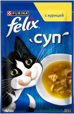 Суп с курицей Феликс подходит для разнообразия питания питомцев. Пакетик 48 гр. Легко открывается. Аромат нормальный у продукта. Рекомендуется давать 1 раз в день, особенно тем, кто мало пьет. Мои питомцы обедают супом почти каждый день, их все устраивает. Организму не вредит.