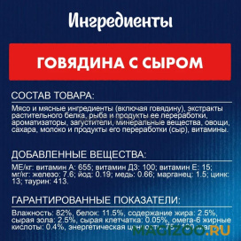 • не содержит искусственных красителей, ароматизаторов, консервантов Состав товара: мясо и мясные ингредиенты (включая говядину), экстракты растительного белка, рыба и продукты ее переработки, ароматизаторы, загустители, минеральные вещества, овощи, сахара, молоко и продукты его переработки (сыр), витамины. Гарантируемый анализ: влажность: 82%, белок: 11.5%, содержание жира: 2.5%, сырая зола: 2.5%, сырая клетчатка: 0.05%, омега-6 жирные кислоты: 0.4%, энергетическая ценность: 75 / 100 ккал / г. МЕ/кг: витамин А: 655; витамин Д3: 100; витамин E: 15;