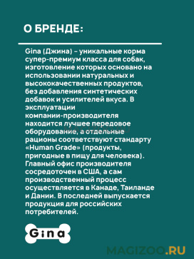 Gina (Джина) – уникальные корма супер-премиум класса для собак, изготовление которых основано на использовании натуральных и высококачественных продуктов, без добавления синтетических добавок и усилителей вкуса. В эксплуатации компании-производителя находится лучшее передовое оборудование, а отдельные рационы соответствуют стандарту «Human Grade» (продукты, пригодные в пищу для человека). Главный офис производителя сосредоточен в США, а сам производственный процесс осуществляется в Канаде, Таиланде и Дании. В последней выпускается продукция для российских потребителей.