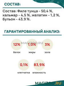 Состав: Филе тунца – 50,4 %, кальмар – 4,5 %, желатин – 1,2 %, бульон – 43,9 %.