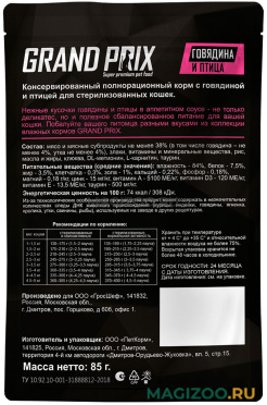 Нежные кусочки говядины и птицы в аппетитном соусе - это полноценное сбалансированное питание премиум-класса для вашей кошки. Влажный корм для кошек GRAND PRIX объединяет отличный вкус и сбалансированный питательный состав, созданный с учетом потребностей домашних животных.