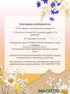 - 75 % мяса в составе (60 % куриная грудка, 15 % креветки).