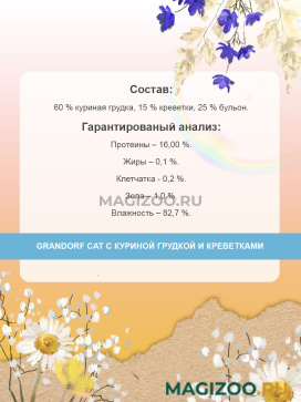 Состав: 60 % куриная грудка, 15 % креветки, 25 % бульон.
