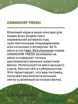 60 % мяса в составе. Все влажные корма GRANDORF FRESH основаны на мясе и содержат только высококачественные животные белки. Животный белок очень ценен и содержит все незаменимые аминокислоты для вашего питомца и полностью удовлетворит его биологические потребности в мясном питании.