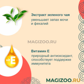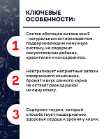 Продукт обогащён витамином Е — натуральным антиоксидантом, поддерживающим иммунитет питомца. Не содержит искусственных добавок, красителей и консервантов. Корм со сниженным содержанием жиров, подходит для стерилизованных кошек и кастрированных котов.