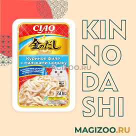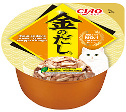 Супер-премиальный влажный корм для кошек CIAO Kinnodashi (ЧАО КИННОДАШИ) от японского производителя Inaba приготовлен на основе кусочков филе фермерской курицы с добавлением мальков ширасу в аппетитном насыщенном бульоне золотистого цвета.