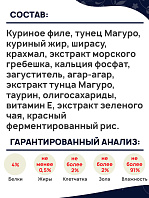 Куриное филе, ширасу, крахмал, экстракт морского гребешка, агар-агар, полисахариды, витамин Е, экстракт зеленого чая, красный ферментированный рис.