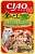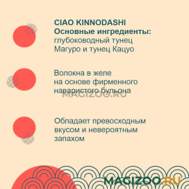 Супер-премиальный влажный корм для кошек CIAO Kinnodashi (ЧАО КИННОДАШИ) от японского производителя Inaba приготовлен на основе кусочков двух разных видов мяса глубоководного тунца с добавлением семги в аппетитном насыщенном бульоне золотистого цвета.