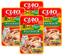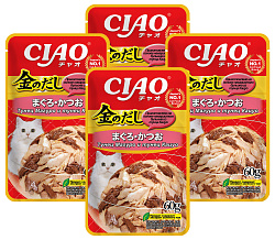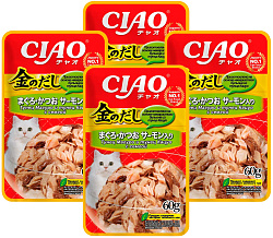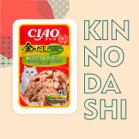 Супер-премиальный влажный корм для кошек CIAO Kinnodashi (ЧАО КИННОДАШИ) от японского производителя Inaba приготовлен на основе кусочков двух разных видов мяса глубоководного тунца с сурими (паста из рыбы с добавлением морепродуктов: креветок, краба, кальмара) в аппетитном насыщенном бульоне золотистого цвета.