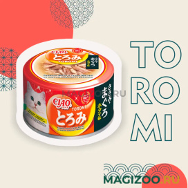 Супер-премиальный влажный корм для кошек Ciao Toromi (ЧАО ТОРОМИ) от японского производителя Inaba приготовлен на основе нежного куриного филе, кусочков мяса глубоководного тунца Магуро с добавлением морского гребешка и насыщенного фирменного бульона.