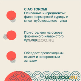 Супер-премиальный влажный корм для кошек Ciao Toromi (ЧАО ТОРОМИ) от японского производителя Inaba приготовлен на основе нежного куриного филе, кусочков мяса глубоководного тунца Магуро с добавлением кациобуси (вяленая стружка тунца) и насыщенного фирменного бульона.