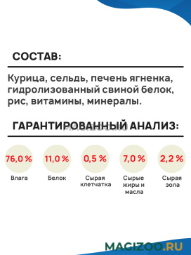 Курица, сельдь, печень ягненка, гидролизованный свиной белок, рис, витамины, минералы.