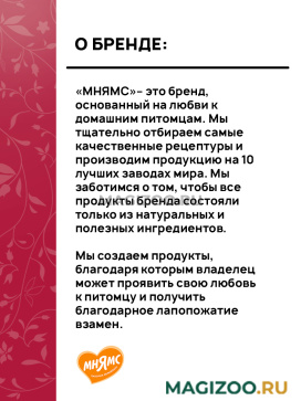 «МНЯМС»– это бренд, основанный на любви к домашним питомцам, поэтому каждый продукт, который мы создаем, а это более 150 видов, мы фильтруем сквозь наши ценности, чтобы создавать бескомпромиссно качественные и вкусные продукты для ваших питомцев.