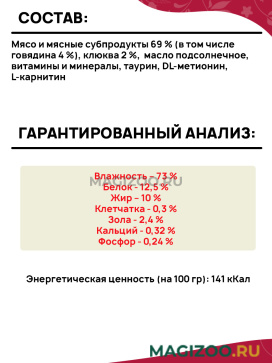 Мясо и мясные субпродукты 69 % (в том числе говядина 4 %), клюква 2 %, масло подсолнечное, витамины и минералы, таурин, DL-метионин, L-карнитин.