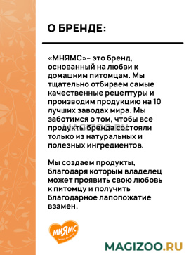 «МНЯМС»– это бренд, основанный на любви к домашним питомцам, поэтому каждый продукт, который мы создаем, а это более 150 видов, мы фильтруем сквозь наши ценности, чтобы создавать бескомпромиссно качественные и вкусные продукты для ваших питомцев.