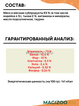 Мясо и мясные субпродукты 69 % (в том числе индейка 4 %), тыква 2 %, витамины и минералы, масло подсолнечное, таурин.