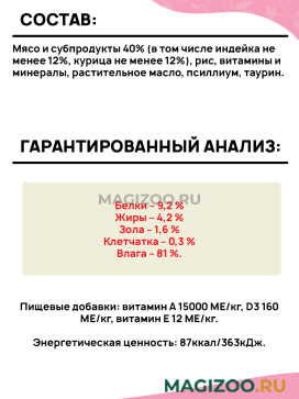 Мясо и субпродукты 40% (в том числе индейка не менее 12%, курица не менее 12%), рис, витамины и минералы, растительное масло, псиллиум, таурин.