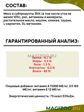 Высококачественный полнорационный сбалансированный влажный корм с уткой подходит для взрослых домашних кошек старше 12 месяцев.