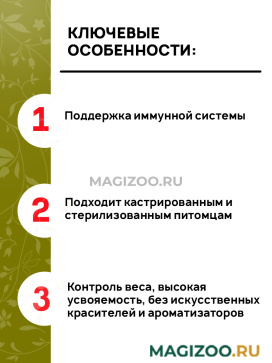 В рационе есть все необходимые витамины и минералы, а также добавлены инулин, L-карнитин, DL-метионин и клюква, которые обеспечивают контроль веса и снижают риск развития мочекаменной болезни.