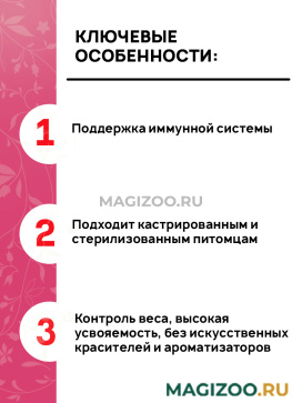 В рационе есть все необходимые витамины и минералы, а также DL- метионин и L- карнитин, которые поддерживают иммунную систему и обеспечивают контроль веса, а также хондропротекторы, обеспечивающие здоровье опорно-двигательного аппарата.