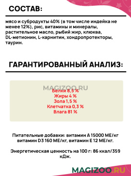 Состав: мясо и субродукты 40% (в том числе индейка не менее 12%), рис, витамины и минералы, растительное масло, рыбий жир, клюква, DL-метионин, L-карнитин, хондропротекторы, таурин.